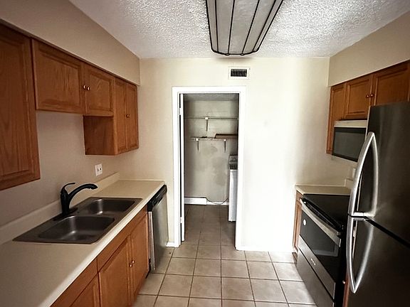 Welcome to this charming lower-level one-bedroom, one-bath condo nestled within the serene gated community of The Springs. This inviting home features a spacious family and dining area, accented with stylish tile and laminate flooring throughout. The galley-style kitchen is equipped with stainless steel appliances, making meal prep a breeze. Convenience is key with an in-unit laundry room featuring a washer and dryer.