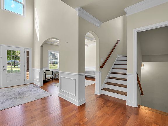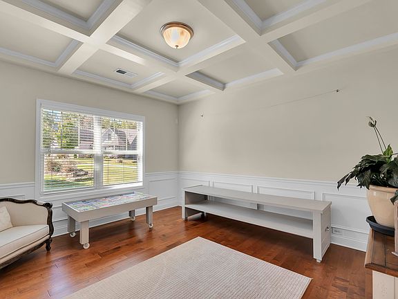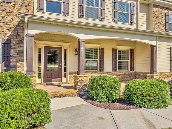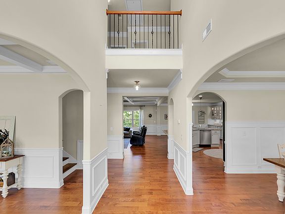 This is the kind of home dreams are made of! Nestled at the end of a quiet cul-de-sac in the highly sought-after gated community of Ridge Water, this 6-bedroom, 5-bathroom home offers space, sophistication, and serenity. From the moment you arrive, the curb appeal shines with beautifully maintained landscaping and a timeless exterior featuring hardboard siding, stone accents, and a welcoming front porch. Step inside the bright two-story foyer with gleaming hardwood floors and an inviting, open floor plan. The living room features elegant coffered ceilings, wainscoting, built-in bookshelves, and a stunning stone gas fireplace—perfect for cozy evenings. The kitchen is a showstopper, boasting granite countertops, chic pendant lighting over a large island, stainless steel appliances, a double oven, and under-cabinet lighting. A charming coffee bar with glass-front cabinetry and ambient lighting adds an extra touch of luxury. The kitchen flows effortlessly into the breakfast area and a screened-in porch overlooking your private backyard oasis. Enjoy the in-ground swimming pool, fire pit area, and large fenced yard backing up to a wooded buffer along South Rabon Creek—ideal for privacy and relaxation. On the main level, you’ll find a formal dining room with tray ceilings, an office/flex space with coffered ceilings and wainscoting, and a guest suite with a full bath tucked behind the kitchen near the drop zone and garage entry. Upstairs, the primary suite is a retreat with a sitting area and gas fireplace, tray ceiling, and abundant natural light. The ensuite bath features dual vanities, a garden tub, separate tiled shower, and walk-in closets. Three additional spacious bedrooms and two full baths complete the upper level. The finished basement offers endless possibilities—complete with a kitchenette, full bath, bedroom, and large recreation areas. French doors open to the patio and pool area, creating the perfect indoor-outdoor entertaining space. With .74 acres, a 2-car garage, and access to community amenities including a pool, clubhouse, and walking trails, this home offers the best of luxury and comfort in an exceptional location.