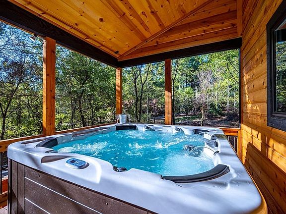 Full-size pool tableSurrounded by towering pinesPrivate deckHot tubWalk-in tile showerStone fireplaceSleeper sofa