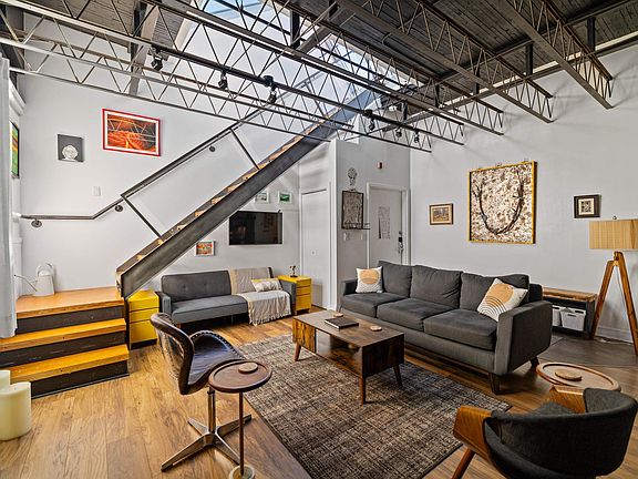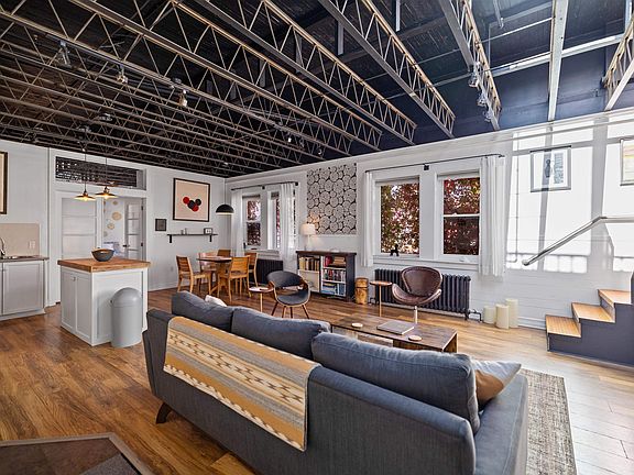 Remarkable lightSoaring ceilingsArchitectural characterOpen living spaceExposed steel trussesWarm paletteReclaimed maple