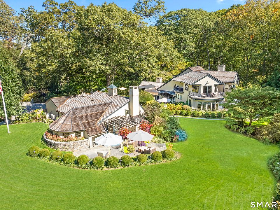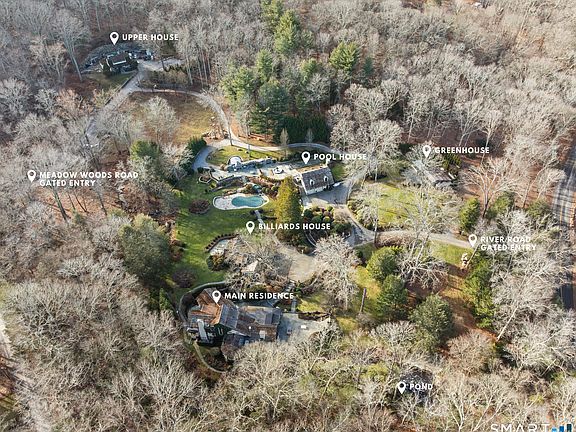 A WORLD-CLASS PRIVATE ESTATE SET ON 9.31 GATED ACRES. Nestled behind a private gated entry, this extraordinary CT River Valley estate is a rare luxury compound of architectural distinction, solitude, & resort-caliber amenities. Thoughtfully composed across 5 distinct structures, the property blends modern luxury, European influences, & timeless craftsmanship amid curated landscapes, stone pathways, terraces, & over 6,000sf of refined outdoor living space. This is a truly exceptional, once-in-a-lifetime offering. A long winding driveway gradually reveals an exclusive enclave where the outside world fades away. Stucco structures, cedar shake roofs, & copper gutters emerge in sequence, unified by professionally landscaped grounds, irrigation, & exterior lighting that enhances the estate's serene atmosphere. Completely rebuilt in 2012, & finished in 2015, the Main Residence is a masterclass in quality & livability. Rich millwork, custom cabinetry, radiant-heated hardwood floors, transom windows, & skylights define interiors that feel both elegant & inviting. A boutique-style coat room & jewel-box powder room immediately signal the home's uncompromising level of finish. The show-stopping kitchen features high-gloss bespoke cabinetry, nickel hardware, & a sculptural range hood beneath tall silver-leaf detailed ceilings. A substantial Calacatta marble island integrates a 2nd sink, butcher block, & concealed storage. Chef-grade appliances include SubZero, Wolf, & Miele. *CONTINUED* French doors open to stone patio w/built-in grill & views of spring-fed pond, creating seamless indoor-outdoor enjoyment. The living room is defined by a graceful barreled ceiling, stunning fireplace, & arched transom window w/water views beyond & leads into a sunroom a/vaulted ceiling, skylights, & built-in orchid garden. The sunken dining room makes a dramatic statement w/travertine floors, a coffered ceiling w/gold-leaf detail, & floor-to-ceiling windows. A club-inspired bar & cocktail lounge features a cathedral ceiling, crystal chandeliers, gorgeous wet bar, & richly textured finishes. The library is a refined study with built-ins, gas fireplace, granite accents, & staircase lined w/bookshelves & a window seat. The primary suite is a personal sanctuary w/stone patio, built-ins, automated shades, & dual walk-in closets w/tailored storage. 2 opulent marble baths include a whirlpool tub, Carrara marble shower, onyx & glass tile finishes, & hand-tailored vanities. An upper loft overlooks the bar & opens out to a covered balcony. The media room offers a cinematic retreat w/paneled walls, coffered tray ceiling, wet bar, & another outdoor balcony. A 2nd bedroom suite, featuring vaulted wood-paneled ceilings, skylights, built-in desk, cedar walk-in closet, & refined ensuite bath, is ideal for weekend visits or extended stays. Beyond the main residence, the Billiards House serves as a guest residence & entertainment pavilion w/vaulted ceilings, pool table room, gas fireplace, kitchen, private bedroom suite, den, 2-car garage, mudroom, & pergola-covered stone patio. On the upper tier, the Pool House is an open studio w/vaulted ceilings, beams, stone fireplace, kitchen, & full bath. Below, a climate-controlled wine cellar features separate red & white wine rooms, wood-paneled walls, tasting areas, exposed rock ledge, & dramatic spiral staircase. Meticulous landscaping frames an in-ground heated pool & spa w/waterfalls, expansive flagstone patios, fire bowl features, a fully equipped outdoor kitchen w/Viking grill & pizza oven, & a bocce court. A glass greenhouse provides year-round cultivation, complemented by an adjacent potting cottage. The Upper House, w/its own gated entrance & 1,600sf of flexible living space, presents opportunities for guests, extended family, or future potential. Rarely does an offering of this caliber become available.