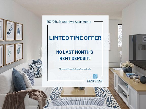 AboutWelcome to 252/256 St. Andrews, where convenience meets elegance at the corner of Southwood and St. Andrews in Cambridge. These charming low-rise apartment buildings feature generously sized two-bedroom suites, perfectly situated in a desirable location. With a modern color palette and upgraded finishes, each apartment offers a stylish living space, complemented by picturesque views of lush greenery just outside your windows and doors. Experience the perfect blend of comfort and natural beauty at St. Andrews.