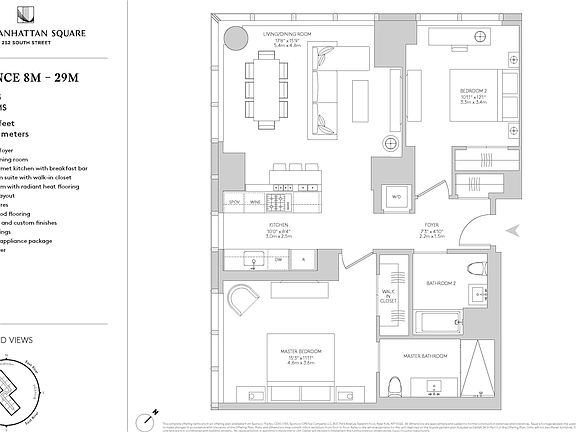 Residence 12M is a two bedroom, two bathroom with an open gourmet kitchen and breakfast bar. This spacious corner residence faces North West and South West, with NY Harbor views and expansive City Skyline. Warm, modern interiors are brought to life by the renowned design team at Meyer Davis Studio. This residence features imported stone and custom finishes, premium Miele appliance package, 5" wide stained oak flooring, master bath with custom wood cabinetry, marble tile walls and mosaic floors with radiant heat, undermount Wetstyle sink with glass vanity top and Dornbracht polished chrome faucets and a washer and dryer.
