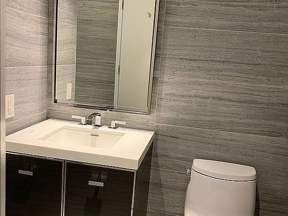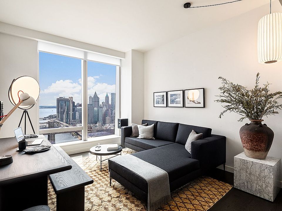 The south west facing unit is 695 square foot one bedroom, one bathroom with an open gourmet kitchen and breakfast bar. This spacious residence faces South West, with spectacular sunset views overlooking the East River and Downtown Brooklyn. Warm, modern interiors are brought to life by the renowned design team at Meyer Davis Studio. This residence features imported stone and custom finishes, premium Miele appliance package, 5 wide stained oak flooring, master bath with custom wood cabinetry, marble tile walls and mosaic floors with radiant heat, undermount Wetstyle sink with glass vanity top and Dornbracht polished chrome faucets and a washer and dryer.