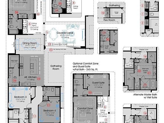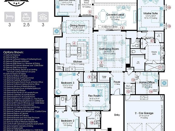 The Avalon is a 1-story home with 3,336square feet, 4bedrooms and 3.5 baths. A gracious entry welcomes visitors into the foyer and home office. The gathering room and dining room are both adjacent to the kitchen with views to the covered lanai. A large master suite with an elegant en-suite bath boasts a huge walk in closet. Two secondary bedrooms share a jack & jill bath and are adjacent the comfort zone that can be an additional bedroom or home office.