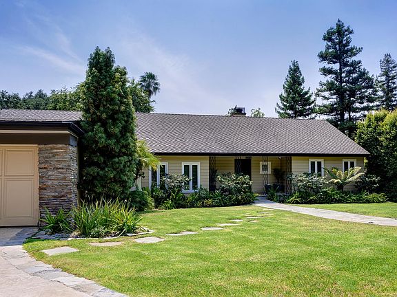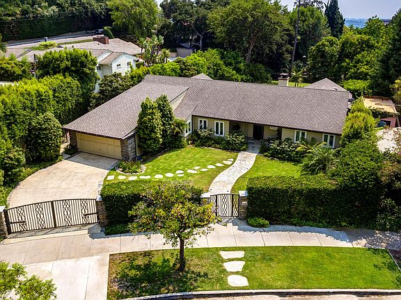 Beautifully updated, gated,1-story Traditional w/ rare flat lot on premiere street. Gracious step-down liv rm features high ceilings, crown moldings, wood floors, fireplace, French doors to patio & private lawn w/ room for pool. Intimate ell dining rm effortlessly expands into liv rm to accommodate larger gatherings. Exquisite gourmet kitchen features center island w/ breakfast bar, quartz & granite, Viking appliances, gorgeous custom cabinetry & incorporates family/media room w/ custom built-ins & French doors to yard. Generous secluded master suite overlooks garden & offers spa-like bath w/ steam shower, double sinks, oversized tub, & spacious walk-in closet w/ custom cabinetry. Quiet cozy den/office is well suited for working at home. Additionally, this home includes 2 intimate guest rooms, newer stylish baths, wood floors throughout & many unseen upgrades (HVAC, electrical, plumbing). This rare offering imparts fine quality, design, privacy, livability & the ultimate CA lifestyle.