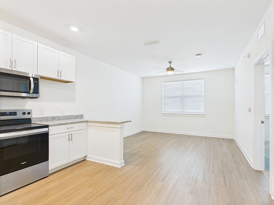 The Balance floor plan on the second floor is a thoughtfully designed one-bedroom, one-bath featuring modern finishes. Enjoy luxury vinyl plank flooring throughout the main living areas and plush carpeting in the bedroom for added comfort. The kitchen features dual-color custom cabinets, and a private walk-through closet leads to your en-suite bath. A full-sized stackable washer and dryer are included in a designated laundry room for convenience.