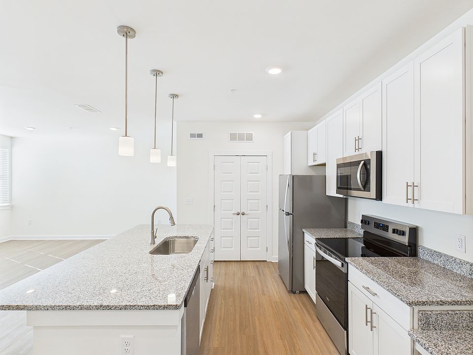 The Balance floor plan on the second floor is a thoughtfully designed one-bedroom, one-bath featuring modern finishes. Enjoy luxury vinyl plank flooring throughout the main living areas and plush carpeting in the bedroom for added comfort. The kitchen features dual-color custom cabinets, and a private walk-through closet leads to your en-suite bath. A full-sized stackable washer and dryer are included in a designated laundry room for convenience.
