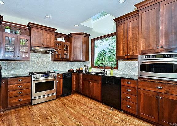 Tucked away on a quiet cul-de-sac in Highlands Ranch, this luxury end unit 3BE 3BA townhome features gorgeous hardwood floors, vaulted ceilings, large view windows, skylights, and three sets of atriumdoors that lead out to one of four patios or decks surrounding the home! A remodeled gourmet eat-in kitchen showcases granite countertops, stylish tile backsplash, recessed lighting, and high end appliances. The formal dining room connects with the spacious Great room that includes a beautiful brick fireplace as well as a built-in wet bar with a wine cooler. The master bedroom has atrium doors leading out to a patio, while the master bath has a double vanity and a large walk-in closet. On the walk out lower level you???ll find a large family room also with atrium doors leading outside, large bedrooms, a flex room with closet, full bathroom, craft room with plenty of storage. Epoxy garage floor. Attic storage in garage. Complex adjacent to large neighborhood Sand Creek Park.