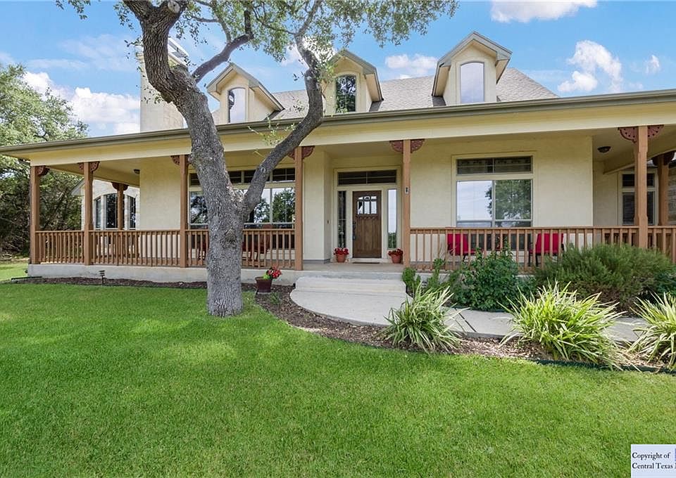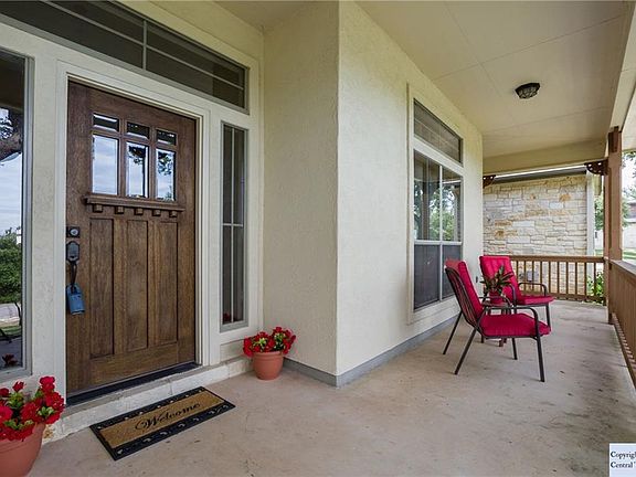 Beautiful 1 story home in River Crossing offers both privacy and Hill Country views. Wrap -around front porch, high ceilings, beams in LR, hand scraped Walnut wood floors, 8 ft doors & 2 limestone fireplaces are a few highlights. Kitchen has granite counters, custom alder wood cabinets & SS appliances. Fabulous resort style pool in private back yard oasis. Spacious master retreat w spa-like master bath is separate from other bedrooms. Laundry room has custom alder cabinets & utility sink. 3+ car garage.