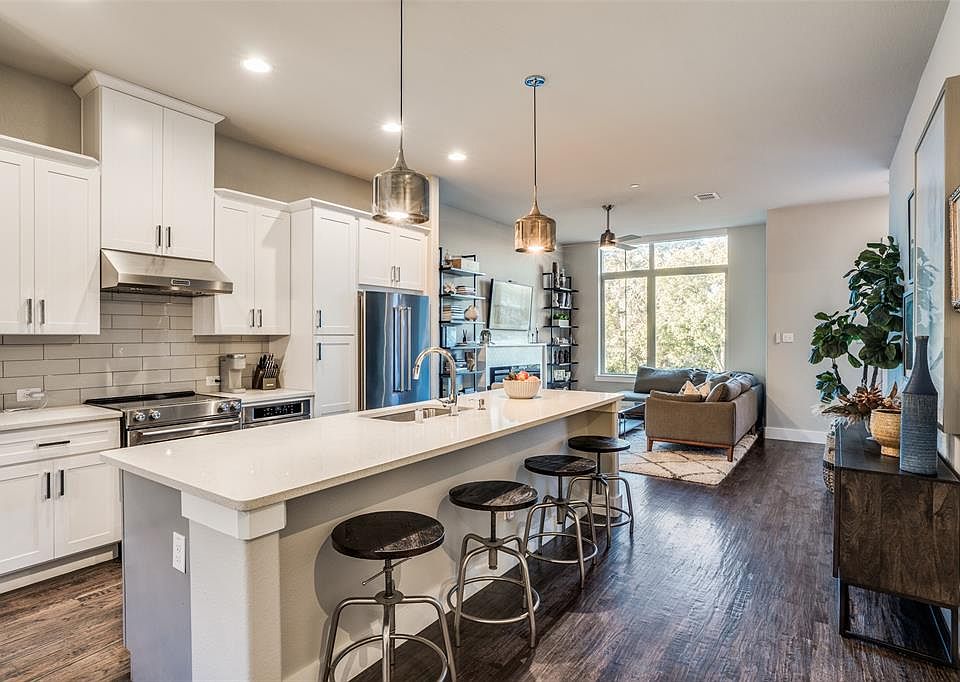 Stunning modern townhouse just minutes away from local fun and freeways. Great community, low HOAs! The 1st floor has a guest bedroom with ensuite as well as a foyer with hand-scraped hardwoods that continue upstairs. The garage area is heated with space for gym equipment. 2nd floor is perfect for entertaining with an open kitchen flanked by a living area and dining area with bar and wine-fridge. The kitchen island is HUMONGOUS! Half bath and balcony are perfect for guests. The 3rd floor is a true retreat. The landing makes a great home office while the guest bedroom sports an ensuite and custom closets. The owner's retreat is spacious, with a private balcony, sitting area and large private ensuite. Must See!