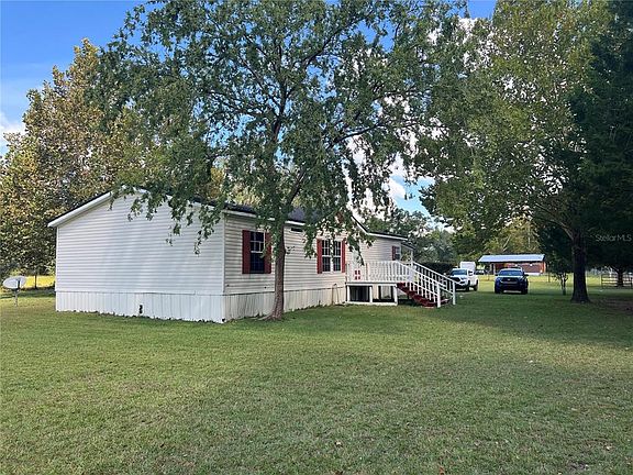 A Rare Treasure! Discover this charming 2000 Grand Manor double-wide mobile home nestled on a fully fenced one-acre lot, perfectly situated between High Springs and Newberry. Enjoy an easy commute to either city, as well as to Gainesville or Lake City. Outdoor enthusiasts will love being just minutes from beautiful rivers and springs for recreation. The well-maintained 3-bedroom, 2-bath home offers laminate flooring throughout, a welcoming living room with a wood-burning fireplace, and a spacious family room that opens to the eat-in kitchen. The kitchen features a bay window overlooking the scenic yard, granite countertops, and all major appliances — electric range, dishwasher, microwave, and refrigerator. The primary suite includes a walk-in closet and an ensuite bath with a walk-in shower. Relax outdoors on the front porch or the covered side porch, perfect for morning coffee or evening gatherings. Additional features include a utility building and lean-to for storage and lawn equipment, both with power connected. There’s also a plug-in for a whole-house generator (generator not included). The roof and A/C were replaced approximately 6–7 years ago, and the septic system was pumped about 4 years ago. The property is attractively landscaped with mature trees and features two metal gates for easy access.