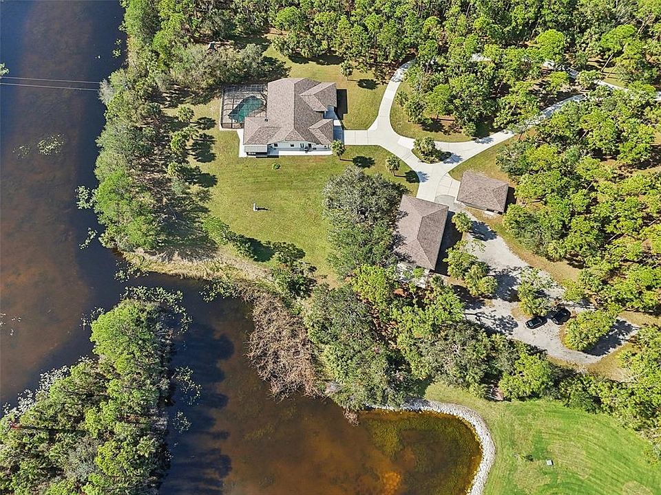 Experience your own personal retreat in this completely fenced and gated five-acre estate. When you first pass thru the front gates and drive the long concrete driveway you will realize you have found a property like no other. Rare acreage in Venice with majestic oak trees, palms and pines. Fully updated with high-end finishes and travertine throughout, this home is designed for luxury and comfort. The wrought iron front doors lead to a chef's kitchen with glass tile backsplash, quartz counters, KitchenAid appliances, counter seating, RO system and a pass-through to the expansive patio—perfect for entertaining.The open living and dining areas feature pocket sliders to the picture window screened pool deck, where a saltwater pool with a Pebble Tec finish and water features awaits. The oversized primary suite includes a sitting area, cedar walk-in closets, and a modern bathroom. A private guest suite with a coffee bar, additional bedroom with pool access and a bonus room with kitchenette and private patio that could be fourth bedroom, complete the split floor plan. The property boasts two versatile outbuildings: one with an oversized two-car garage and workshop, and another with large overhead door for RV or boat storage, a car collection, studio, man cave or home business. This incredible building is 1925 sq ft finished with a 5ton AC unit, hurricane windows and two sets of hurricane, commercial glass French doors with sidelights leading to a large private patio. Secondary gated driveway offers added convenience. The backyard pond enhances the tranquil setting, perfect for fishing or relaxing. Bring your chickens with plenty of room for your garden. Recent updates include a newer roof, A/C units, plumbing and light fixtures, hurricane-rated windows and doors, pool heater, water treatment system, and a 400-amp electrical upgrade. Located just 10 minutes from downtown Venice and close to beaches, dining, and golf. A truly exceptional property Move-in ready and waiting for you!