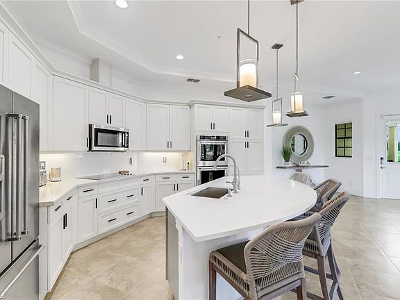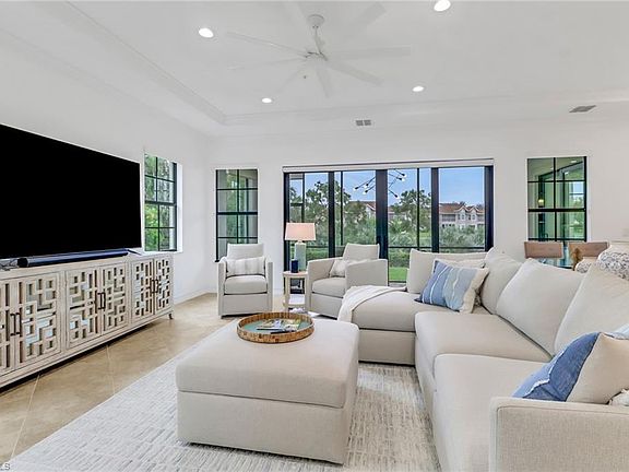 Immerse yourself in Naples paradise at this sought-after open floor plan end unit in Regatta Landing at Windstar. This luxurious coach lives like a single-family home with an attached 2-car garage, enclosed lanai, and breathtaking western vistas of the championship golf course and endless lake view sunsets. Inside, a well-designed layout seamlessly connects the great room to a chef-inspired kitchen boasting stainless steel appliances, quartz counters, and a wine cooler. Exquisite finishes, tray ceilings, and wood/tile flooring throughout elevate the ambience, while the owner's suite beckons with a sitting / workout area, walk-in closets, and a spa-like bathroom. Beyond your doorstep, a world of amenities awaits - boat shuttles to a private beach, sunset cruises, tennis, fitness, sparkling pools, and vibrant downtown Naples just a 3-mile drive away. This small and private section of Windstar features its own pool/spa and cabana, and a separate entry and exit accessing Bayshore Drive. Regatta Landing is the epitome of luxurious living in Naples - don't miss your chance to make it yours!