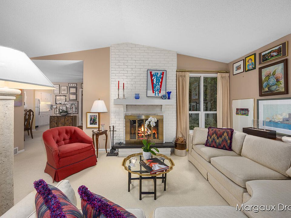 wood-burning fireplace creates a cozy atmosphere in the main living area.