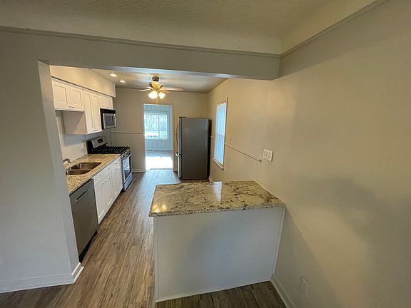 Kitchen is completely remodeled with new cabinets and granite counter tops. Featuring a peninsula style cabinet dividing the kitchen from the living room with an open floor plan. Stainless steel appliances with new white and gray shaker cabinets gives the kitchen a modern and up to date appearance.