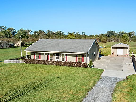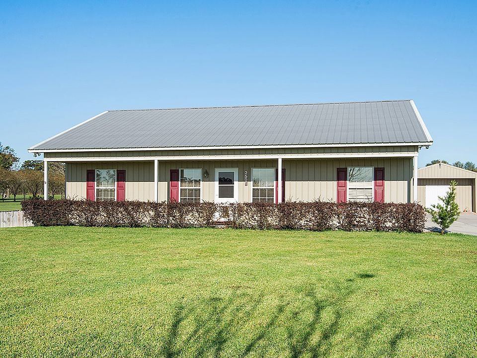 This home is located in Pointe Coupee, just a short, easy drive away from traffic in Baton Rouge. If your looking for the perfect rural community with great neighbors, new construction, on acreage, this is it! The frame of the house is a welded together metal structure with traditional wood framing on the interior walls and ceiling. The metal exterior and roof are solid construction. The acadian style home has a expansive front porch, covered rear porch and patio, covered carport parking, attached storage room and a detached workshop. As you enter the home the living room ceiling is vaulted with recessed can lighting and ceiling fans. The open floor plan combines the living room, dining area and kitchen. The island has overhang for bar stools and a gas range with a special vented light above. The kitchen appliances also include a dishwasher, refrigerator and gas range. The master bedroom is large with a great walk in closet and the master bath features a tiled 4 foot custom shower. The 2nd bedroom is adjoining bathroom that has a jetted tub. The office can be converted to a 3rd bedroom if preferred. It currently has built in book cases and a desk. The laundry room is very spacious with a gas dryer to remain. Seller pays $366/year for flood insurance and the policy is transferrable to the buyer. 36 inch doorways throughout.