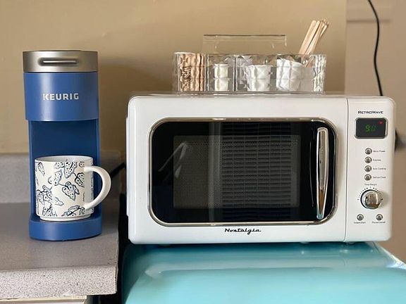 A Keurig coffee maker with complimentary coffee, sugar, and cream.