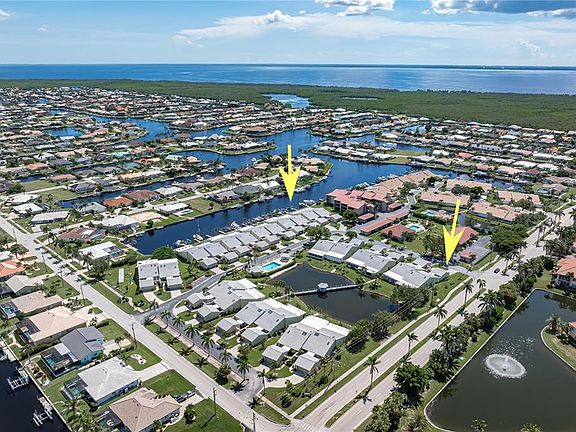 PGI WATERFRONT VILLA W/DEEDED DOCK, SAIL ACCESS & SCENIC LAKEFRONT VIEWS - Ideally located in heart of Punta Gorda Isles, this spacious 3 bed/2.5 bath villa w/just over 2,000 sqft in Isles Cove delivers picturesque lake views, a deeded dock just steps from your door, and direct sailboat access to Charlotte Harbor — all within a beautifully maintained, park-like setting. Inside, the home’s layout is spacious & bright w/cathedral ceilings & skylights that enhance it all. A wall of sliding glass doors opens to the lanai extending the living space outside. Sliding glass doors & windows frame tranquil lake views from the great room and lanai. The open-concept kitchen offers warm wood cabinetry, granite counters, under-cabinet lighting, updated appliances & a closet pantry. Pass-through counters to the dining area make entertaining a breeze. Architectural details include a formal entry w/coat closet, soaring cathedral ceilings, arched doorways, wet bar & gleaming wood floors in the great room. The split-bedroom floor plan offers a private owner’s retreat with two walk-in closets and lanai access. The owner's en-suite bath includes dual vanities, a glass-enclosed tile shower, and a jetted corner tub. Two additional bedrooms offer flexibility for guests, a home office, or hobby space, and share a well-appointed guest bath. One guest bedroom has a Murphy bed already in place. The powder room off the main hallway adds convenience for entertaining. Outside, the spacious, tiled lanai overlooks the lake & gazebo. Out here, you'll be able to enjoy the extending living space year-round plus have access to colorful sunrises w/your morning coffee. The villa also features a private two-car garage connected by a gated courtyard entrance. Keep your boat just yards away at your deeded dock (Dock #23). Dock features water & shared, metered electric hook-ups plus a 10,000 lb boat lift (installed 2019). The entire unit was re-plumbed w/overhead piping. Other updates include a smart thermostat, NEW impact-resistant windows along Marion Ave, NEW A/C (2022), NEW refrigerator (2025), NEW ROOF (2024) & NEW plexiglass sliding windows on lanai (2022). Community amenities include a heated pool, guest parking, and beautifully landscaped grounds. Miles of sidewalks in Punta Gorda Isles connect you to Ponce Park, historic downtown, Gilchrist Park & Fisherman's Village. Life in Punta Gorda is about more than boating—it’s about enjoying every moment. Tee off at local golf courses, rally with friends on the tennis or pickleball courts, or pedal along miles of scenic bike paths. On weekends, the city comes alive with music, art fairs, and vibrant festivals. Add in the weekly farmers markets brimming with local produce and the boutique-lined streets of Marion Avenue, and you’ll see why Punta Gorda is a community where every day feels like vacation. Claim your spot in paradise by making an appointment today.