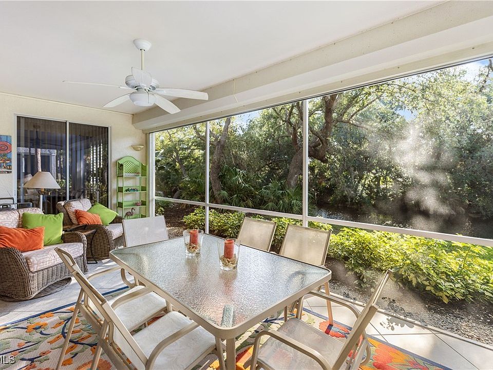 Welcome to your slice of paradise in Pelican Landing! This vibrant 3-bedroom condo boasts a one-owner history and comes fully turnkey. Enjoy breathtaking private creek views from your lanai, where each sunset is complemented by the lush, mature Florida landscaping. It's never too hot or cold on the lanai once you lower your storm shutters - you can use that extra space year-round. Inside, the ambiance is set by fun and colorful furnishings, creating a lively atmosphere that perfectly complements the coastal lifestyle. Meticulously maintained and only used seasonally, this end unit condo kitchen features quartz countertops, new cabinets and colorful subway tile backsplash. The bathrooms were also updated offering a modern touch to your oasis. The leather sofa and loveseat are a new addition to the unit. Pelican Landing isn't just a place to live; it's a lifestyle. Dive into exclusive amenities including access to a private beach for soaking up the sun, pickleball and tennis courts for staying active, and bocce ball for some friendly competition. Want to explore the water? Launch your kayak and paddle through the tranquil creeks just steps from your door. Creekside Crossing has two pools, a hot tub and a lovely cabana. If you play golf, The Nest Golf Club is within Pelican Landing and offers Golf or Social memberships. With its unbeatable location, stunning views, and endless amenities, this Pelican Landing condo is more than just a home—it's a dream come true. Don't miss your chance to experience the ultimate in coastal living!
