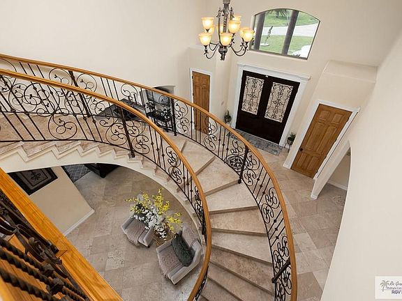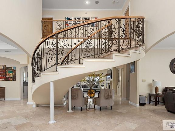 Sparkling pool with waterfallBeautiful backdropTravertine flooringGranite countertopsDramatic spiral staircaseCovered patioSpacious walk-in closet