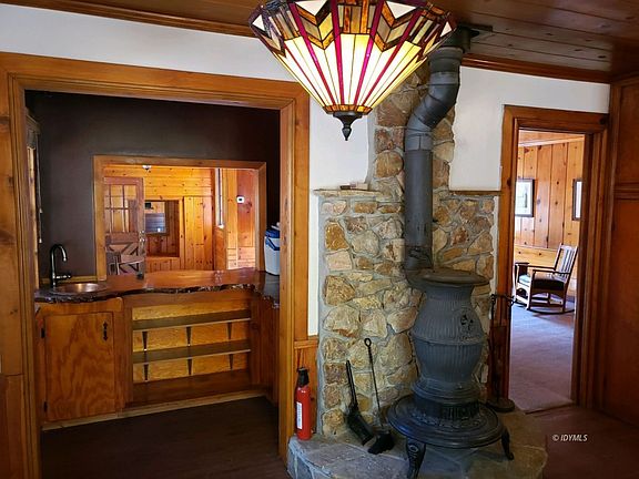 Old Idyllwild charm with knotty pine interior & shingles on the exterior. Large living room with rock fireplace & wood mantle. Kitchen and bathrooms have pounded copper sinks, open breakfast nook with bar for entertaining. Master bedroom on the main floor with special tin ceiling and full bath. Upstairs has a half bath & large sleeping room. Below is a separate Apt. for rental income or studio. Back yard has a great little shed for a pony or chicken coop. Also nice area for garden. Partly fenced for your pet. Separate garage and easy access in winter. Great location on .35 acre flat lot.