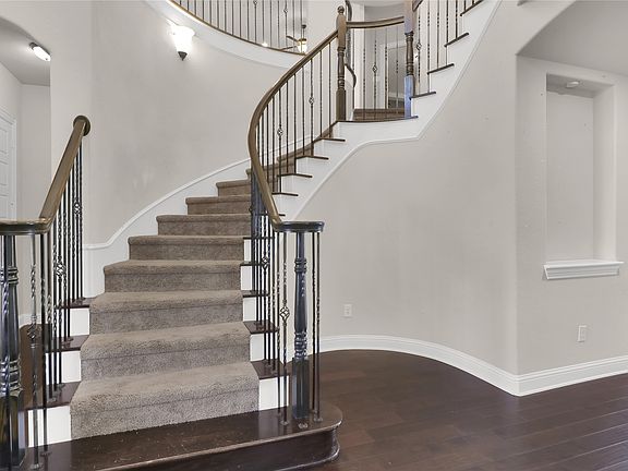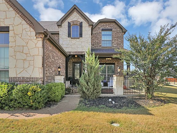 Exquisite John Houston custom home, known as the Carter Floor Plan, located in a gated community. It features 4 bedrooms, 3.5 bathrooms, a home office, and a mud room. The kitchen, living room, and dining area are designed in an open floor plan, boasting impressive 24-foot ceilings in the living room. The kitchen is a culinary enthusiast's paradise, equipped with a level island and breakfast bar, a pot filler, and a gas cooktop. The living room is enhanced by an electric fireplace and bi-fold doors that open to the outdoor patio, creating an ideal space for entertaining. The master suite is generously sized and overlooks the backyard. The master bathroom includes a luxurious soaking tub, dual vanities, a walk-in closet, and a spacious shower. The second bedroom located on the ground floor has its own private entry and a full bathroom conveniently situated nearby, making it perfect for a mother-in-law suite or a teenage child. The covered patio is fitted with a ceiling fan for cooling and a brick gas fireplace for warmth. On the upper level, you will find a game room, a media room with a half bath, and two additional bedrooms that share a full bathroom.