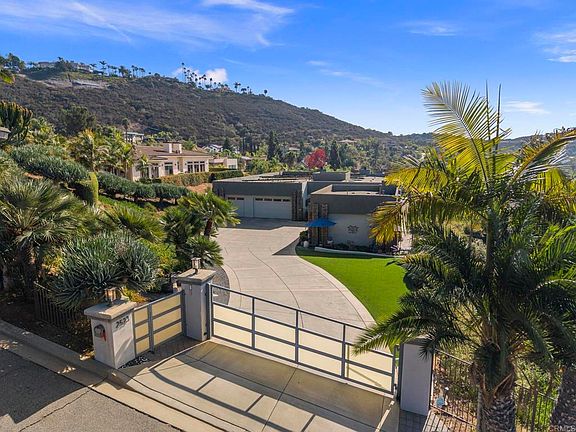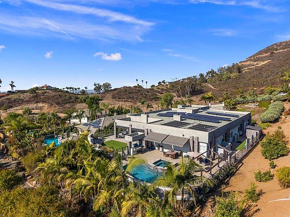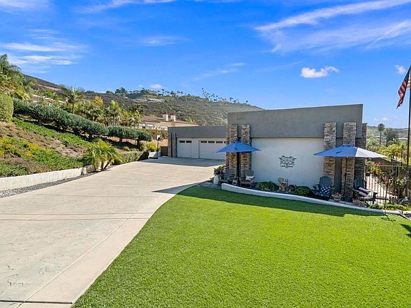 Stunning Frank Lloyd Wright-Inspired Contemporary Home with Ocean Views! This remarkable 4,895 square-foot home blends modern luxury with architectural elegance. Inspired by the timeless principles of Frank Lloyd Wright, the open floor plan allows for seamless flow between spaces, ideal for both everyday living and entertaining. Enjoy breathtaking ocean views from multiple areas of the home, including the spacious patio. The home is designed for both comfort and security, featuring a state-of-the-art wired security system with cameras and alarm, as well as security gates for peace of mind. Outdoor living is enhanced by a solar-heated saltwater pool and jacuzzi, complemented by a fire and water fountain. The backyard also offers a firepit, an electric-powered awning, and a covered patio with heaters, ceiling fans, and TV – perfect for year-round enjoyment. A professionally installed succulent garden adds natural beauty with low-maintenance landscaping. Inside, the gourmet kitchen features dual dishwashers (one new), a Viking refrigerator, warming oven, and a wet bar with custom wine storage and wine refrigerator. The open floor plan boasts slate flooring throughout, a central vacuum system, and electric-powered window shades. The master suite includes a fire-and-ice fireplace, built-in shelves, and a headboard. Additional highlights include a spacious 600 sq ft ADU/Casita with its own kitchen, fireplace, bath, washer/dryer, and bedroom, ideal for guests or extended family. The home also includes a 3-car garage with full cabinetry, workbench, and new water heaters. With energy efficiency in mind, the property features a 34-panel solar system (with a 20-year pre-paid lease, 10 years remaining) and 3 new air conditioning units to ensure year-round comfort. This stunning home is the epitome of sophisticated design, offering an unparalleled lifestyle with all the modern conveniences you could desire.