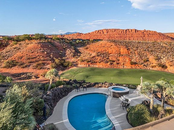 Perched high above the 18th green at Entrada Country Club, this immaculate home features unobstructed views of Snow Canyon State Park and Kachina Cliffs on absolutely one of the finest lots in all of Entrada. The desert oasis is complete with a private pool & spa, fire and water features, two fireplaces, and solid wood doors. The grand great room includes a gourmet kitchen with spacious walk-in pantry. All furnishings are included with a few exceptions. Entrada is southern Utah's premier gated golf course community. The lifestyle includes a restaurant, clubhouse, and community events. The clubhouse includes two pools, fitness center with a variety of daily classes, spa, pickleball, tennis and volleyball.