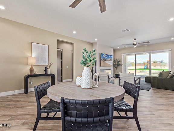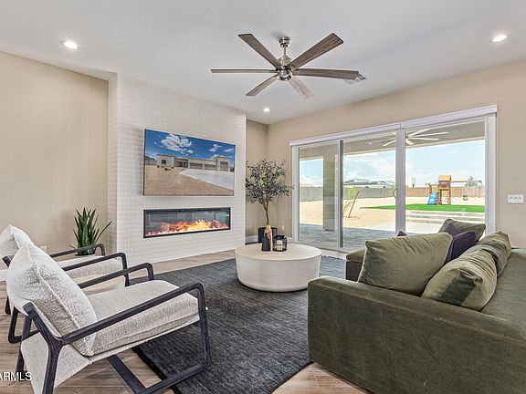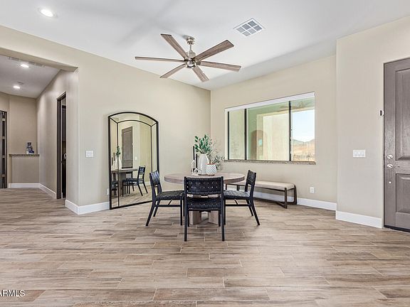 Discover this pristine 4-bedroom, 3.5-bathroom home, barely lived in for four months since its construction, yet enhanced with over $110,000 in luxurious upgrades since move-in. The residence boasts a sprawling 47'x19' RV garage that seamlessly connects to an additional 4-car garage, offering ample space for vehicles and storage. Enjoy the convenience of fully paved access to the property, including an oversized concrete driveway. The property benefits greatly from its location directly across the street from miles of state trust land, which enhances its already amazing views. Inside, the home exudes modern elegance with wood-like tile plank flooring, soaring ceilings, and an open-concept layout ideal for comfortable living. An electric fireplace creates a cozy focal point in the spacious living room, while the large kitchen island invites gatherings with its abundant seating and plenty of cabinet space. A versatile nook provides flexibility for a coffee bar, breakfast area, or window bench. The masterfully designed laundry room includes a practical mudroom area, adding to the home's functionality. Outside, the fully landscaped backyard is a retreat with extensive pavers, artificial turf, and a generously sized covered patio, perfect for outdoor entertaining or relaxation. Privacy is assured by a block wall enclosing the backyard. Conveniently situated directly across from state land, the home offers breathtaking mountain views and easy access to hiking and riding trails. Quick connectivity to the I-17 ensures effortless commuting and access to amenities. This home is perfect for those seeking a move-in ready property.