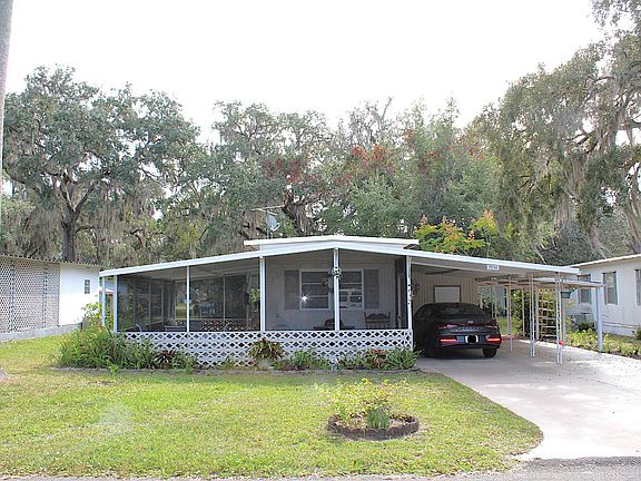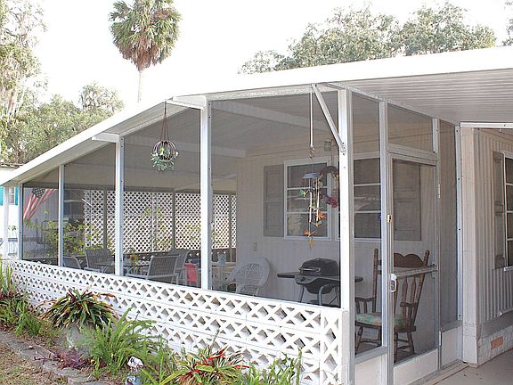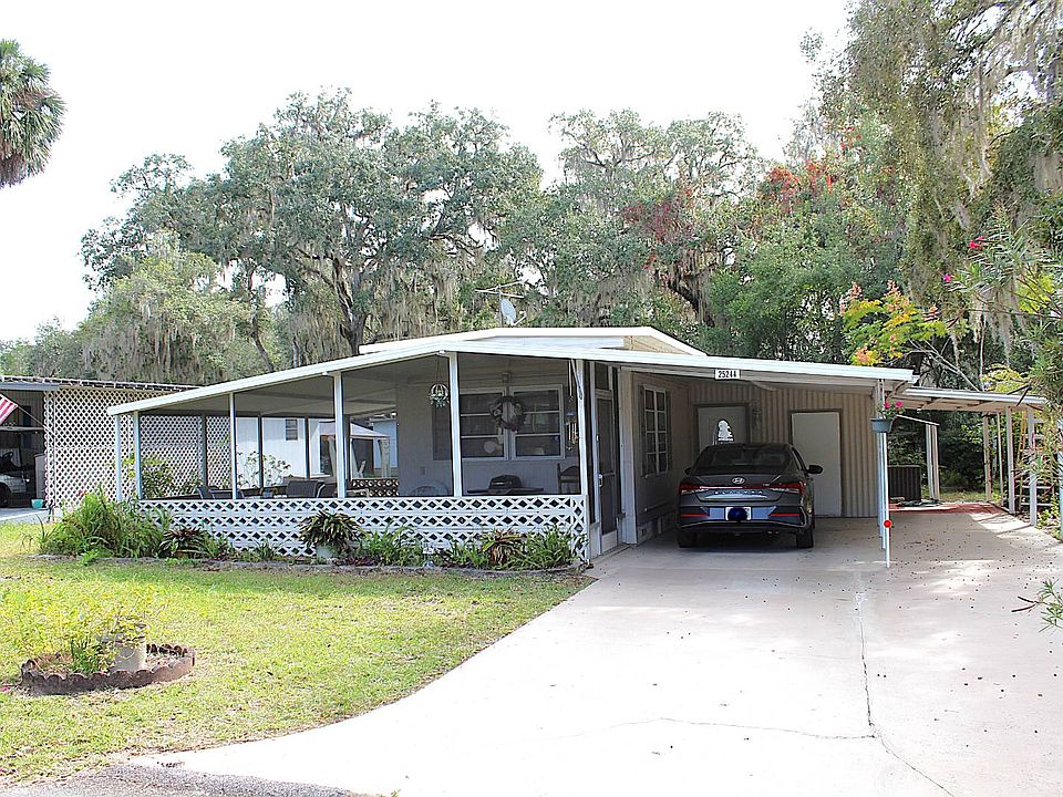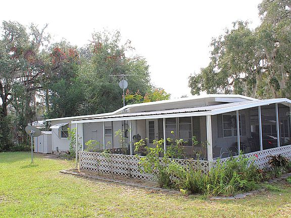 Well-kept 2-bedroom, 2-bath home right by Lake Kerr, which can be seen from the lanai! The primary suite offers a jacuzzi whirlpool tub in working order with its own dedicated water heater-that's right, two water heaters, one for the home and one for the bath. The guest bathroom includes a convenient walk-in shower. Enjoy a cozy living space that opens to a large wraparound front lanai, perfect for relaxing or entertaining. The home also includes an indoor laundry room, storage in the carport, and a large shed in the backyard for extra space. A full-home water filtration system and a new A/C unit add to the comfort and value of this move-in ready home. The community offers a clubhouse and pool for residents to enjoy. Great location and priced to sell-don't miss this must-see property near Lake Kerr!