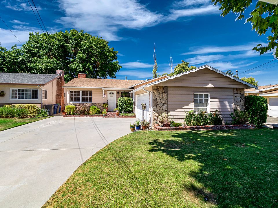 This adorable one story 3 bedroom and 1 1/2 bath home is located close to shopping, schools, parks and great freeway access. The yard is something to see! HUGE backyard with grass, covered patio with lots of room to add pool, etc. Kitchen counters, sink and backsplash has been remodeled. Beautiful laminate wood flooring throughout. The family room has a wood burning brick fireplace which ads to its charm. Indoor laundry room off the kitchen makes it so convenient! The wood accents throughout really bring out the charm in this very special home. Ready for someone to move in and enjoy for many years.
