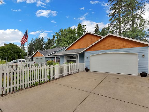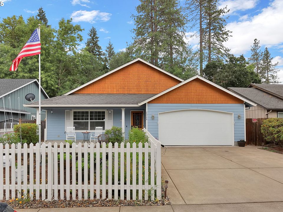 PRICE REDUCED!! Easy Show, come by and check out This light and bright 3-bedroom, 2-bath home offers comfort and convenience with spacious living areas and thoughtful design. Enjoy vaulted ceilings in the living and family rooms, creating an open and airy atmosphere. Luxury vinyl plank throughout, no carpet in home. The kitchen boasts stainless steel appliances, granite countertops, a breakfast bar, and plenty of counter space—perfect for both daily living and entertaining. The primary suite features a vaulted ceiling, walk-in closet, and a peaceful retreat. A dedicated laundry room adds functionality with ample counter space. Step outside to a private covered back porch overlooking mature trees—ideal for relaxing evenings. Greenway behind home offers privacy and no homes directly behind. The fenced front yard includes a covered patio enhancing both beauty and ease of maintenance. The owner converted front yard to small, raised garden beds but can easily be converted back to sod/grass if desired. Back yard has fence across patio but can be removed easily to open onto greenway. Property lines go about halfway into trees. This home offers the perfect blend of peaceful living and convenient access. 15 min to Eugene and 45 min to the coast. Schedule showing and check it out!! Bring offers! PS Turkeys come with the neighborhood.