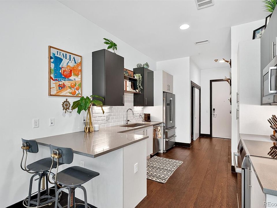 Welcome to your dream 1 bedroom, 1 bathroom condo - a sleek, newly built secure/gated building that blends cutting-edge sustainability with effortless city living! Located in one of the city's most walkable and vibrant neighborhoods, this modern residence is perfect for buyers who crave style, convenience, and a lighter environmental footprint. Some amazing features include open-concept living with oversized windows and sliding glass door flooding the space with natural light, a designer kitchen with energy-efficient appliances and premium quartz countertop finishes, designer wallpaper, smart climate control via high-efficiency HVAC and solar panels on the building, high efficiency windows and superior insulation for year-round comfort and quiet. THere is also a stackable washer and dryer in unit, for your convenience! Outside your back door, you have a wonderful private patio are and open space complete with picnic tables and a nice grassy area and beautiful landscaping. It is a huge benefit being on the first floor because you don't have to deal with the elevator and you can walk right out the back slider with your furry friend with ease. You’re steps from local cafes, artisan shops, parks, nightlife, and multiple transit options — everything you need is just a short stroll away. This unit also comes with 1 deeded parking space and a deeded storage locker, rare for the building and area! Whether you're a first-time buyer, downsizing, or investing in your future, this home offers the perfect combination of style, sustainability, and location. It is also STR approved by the HOA, so you can offset your mortgage with rental income, the ultimate house hack opportunity! This one is a great blend of everything good in a property! Come see it today!