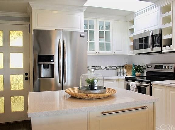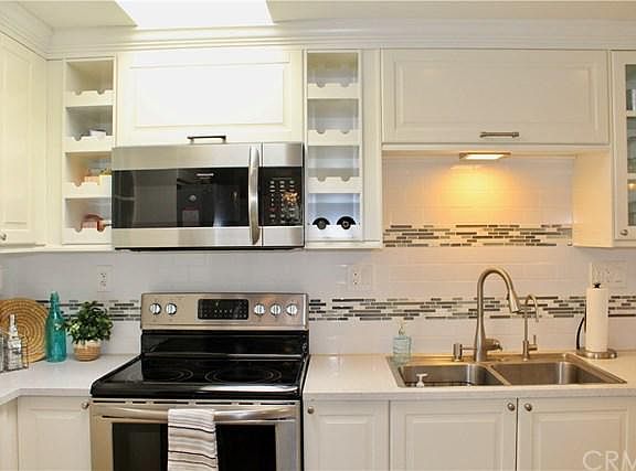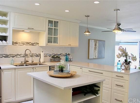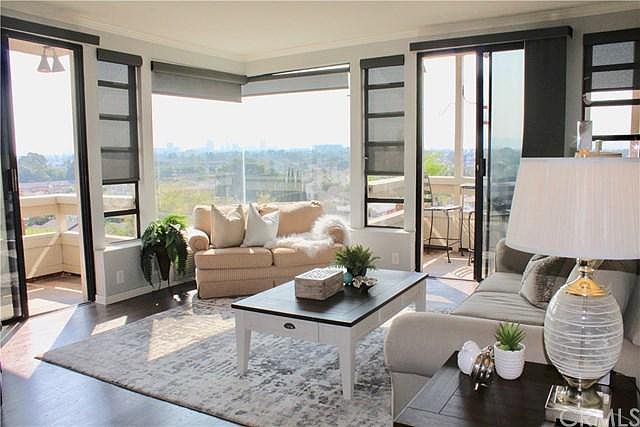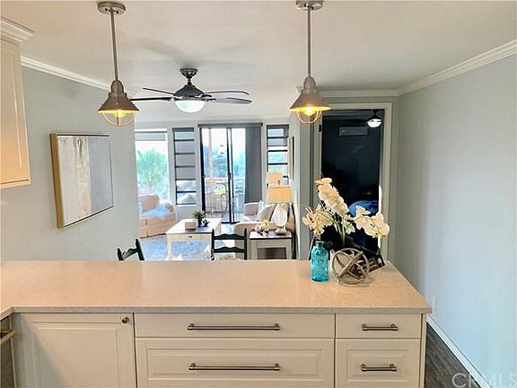 BEAUTIFUL PANORAMIC VIEWS capturing Palos Verdes, Catalina Island and the LB Harbor! This absolutely stunning remodeled home has a contemporary open floor plan and is flooded with natural light beaming from the large windows/sliders. The kitchen has been beautifully remodeled with an island and ample storage, custom quartz counter tops, newer white cabinets, stainless steel appliances, under cabinet lighting, dimmer switches and recessed lighting. The lovely kitchen opens out to the spacious living room/dining room & TWO BALCONIES! Both balconies can capture the beautiful sunrises and sunsets. This home features newer engineered laminate flooring throughout, new A/C for the living room and another one for the second bedroom, ceiling fans in dining room and both bedrooms. The large master bedroom has a sliding door that takes you to the balcony, an abundant organized closet space, a remodeled master bathroom with a built in Roman bath and a skylight. There is an enclosed washer/dryer area in this unit for your convenience, a one car garage and plenty of additional parking off site. This gated community includes a pool, recreation room, sauna and a stunning rooftop deck with a kitchenette and a BBQ for your relaxation or private parties. It is a resort style rooftop with views that you will not want to miss. Enjoy nearby walking trails, parks, shopping centers & dining!