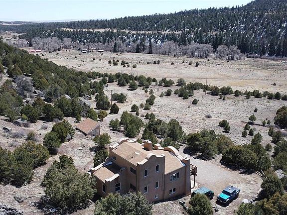 DISTRESSED SELLERS drop price $61,000 from $460,000 to $399,000. Grab this bargain NOW! Tucked into mature Pinon and Juniper trees on 28 acres of quiet mountain land bordering National Forest, this unique Santa Fe-style home offers the kind of solitude that’s hard to find—yet it’s fully connected with grid-tied electricity, Starlink internet, and year-round county road maintenance. Roughly 40 minutes from town, it’s a true getaway without the off-grid complications. Built with intention and character, the home features salvaged architectural elements from Santa Fe, including historic columns and solid wood doors that bring warmth and authenticity to the space. The passive solar design—anchored by a wall of south-facing windows—naturally heats the home, while quality insulation and efficient construction help keep it comfortable year-round. Each room has its own electric heat source, with additional propane heaters in the living room and main floor bedroom. The layout is flexible and inviting, with three bedrooms and two bathrooms. Choose your primary suite: either the spacious main-floor bedroom with an adjacent full bath, or the upper-level suite featuring a private ¾ bath and panoramic views in every direction. All windows offer a front-row seat to the surrounding wilderness—and the views are simply breathtaking. The kitchen is fully equipped with an electric stove, refrigerator/freezer, microwave, and dishwasher. A stacked washer and dryer sits just off the kitchen for easy access. Downstairs, a naturally cooled pantry stays a steady 50 degrees all year—perfect for food storage and preservation. Outside, the year-round greenhouse is a major bonus, complete with power, water, a fan, and supplemental heat—ready for your gardening projects in any season. There’s also a fire pit for quiet evenings under the stars, with deer, elk, bighorn sheep, and the occasional bobcat often passing through the property or nearby meadow. The ground floor/basement garage includes a well-equipped workshop, extra storage, and an additional freezer. The home has been designed for durability and ease of maintenance, with 2x6 framing, 14" wood I-beam rafters, 5/8” drywall, and both blown-in and foam board insulation. Winterizing is simple if you plan to be away for part of the year. Most of the furniture is included, making it easy to move right in and start enjoying your own private mountain escape—where every window frames nature, and every detail supports a life of peaceful, low-maintenance living. Property is occupied. 24 hours notice required for all showings. Buyer's agents must accompany buyers on all showings and appointments.
