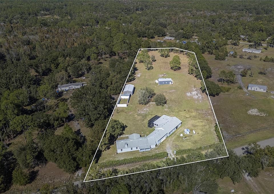 Discover the perfect blend of modern and country tranquility on this rare 5-acre multi-generational property, featuring two move in ready homes. The primary home built in 2022 showcases a spacious open, split floor plan with 2 bedrooms, 2.5 bathrooms, and 2,109 sq. ft. of thoughtfully designed living space. Entertain effortlessly in the kitchen with custom cabinets and granite countertops, while guests gather in the expansive living areas or enjoy the large screened lanai (brick pavers) overlooking serene acreage. Abundant storage and functional design make everyday living a pleasure. The updated secondary home (accessory dwelling or mother-n-law) offers a full kitchen with 3 bedrooms, 3 bathrooms, spacious split floor plan and 2038 sq ft of additional living space. Primary Bedroom has 2 separate bathrooms. One of the primary bathrooms has a soaking tub with a separate shower. An additional room in the home can be used as a flex room, den or additional storage. Another large rear porch for additional entertainment or relaxing. Again another great HOME for additional entertaining. Both homes are seamlessly connected by a 2-car garage. Easy access to both homes without stepping outside. Additional highlights include an automatic front gate, 24k generator, 500-gallon propane tank (owned), commercial-grade saltwater filtration system, metal-roof barn - AC Controlled (25x40), workshop (52x25), septic and drain field redone in 2023, and well and pressure tank replaced in 2025. Primary home has a 2 zone AC unit. This property is ideal for entertaining, hobby farming, or simply enjoying the charm and freedom of country living, this property offers unmatched versatility and lifestyle appeal. The primary home has an additional carport on the side for more parking. Bring all your toys and enjoy country living, Schedule your showing today! Within minutes to I4