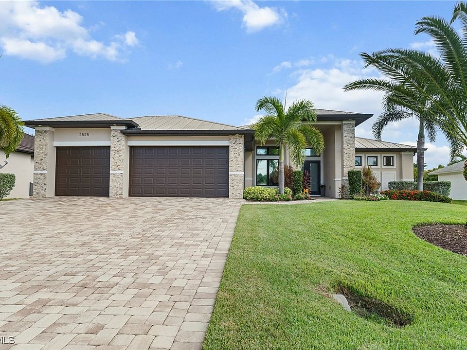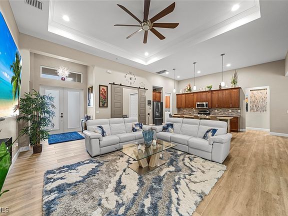 This exquisite modern home, nestled in the highly sought-after Surfside area of Cape Coral, offers luxurious living with a focus on open spaces and contemporary design. The spacious and bright living areas feature high ceilings and abundant natural light. The state-of-the-art kitchen boasts a large island, perfect for cooking and entertaining.