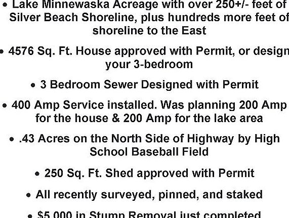 Selling my Lake Minnewaska North Side Acreage bare lot with hundreds of feet of Minnewaska shoreline footage (over 200 feet on Silver Beach). Roughly 3 acres (see attached plat). Level to the Lake and features an approved 3-bedroom Home (or design your own) and a 3-bedroom Septic System, with 400 AMP electric service already installed. Located basically across from the Minnewaska High School on Silver Beach Road. The lot just had several stumps removed from the Building Area. Lake Minnewaska is in Pope County, Minnesota, and is roughly 8,050 square acres. It has 20 miles of shoreline, a maximum depth of 32 feet, and is the 13th largest in MN.