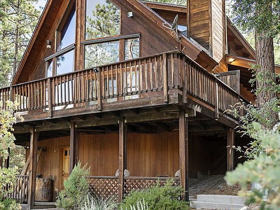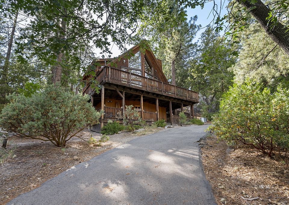 Custom-built in 1991 and lovingly cared for, this prow-front cabin is located in the coveted Foster Lake enclave of Idyllwild on a private road, with enchanting views of Lily Rock! This 3 bedroom, 2 bath home sits on a half-acre, wooded parcel with a bordering seasonal creek. The main level of the house provides a bright and open living space with soaring tongue and groove wood-beamed ceilings, a fireplace with custom woodwork detail, and dramatic floor-to-ceiling windows that frame incredible east-facing views. Cedar-trimmed French doors lead out to the home's expansive wrap-around front deck. The kitchen has a tiled breakfast bar and opens to the dining area. This level also has an enclosed laundry space, bathroom, and primary bedroom with French doors that lead outside to a private patio area. The second floor has a loft with seating area; a perfect spot for reading and taking in the views, and two guest bedrooms with a bathroom in between. The exterior of the house has a separate access to a large subspace that could also be used for workshop. Showings by appt only. Please do not drive by or disturb neighbors as the street is very private.