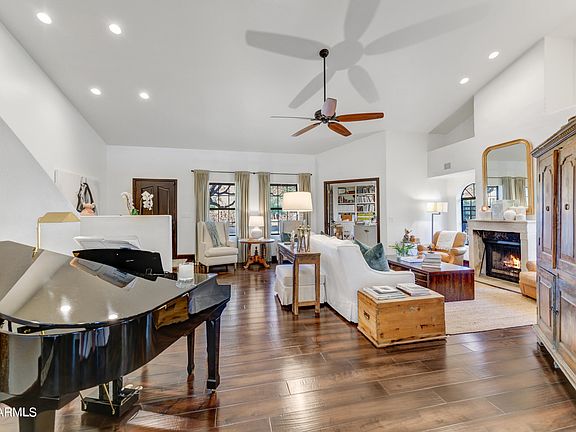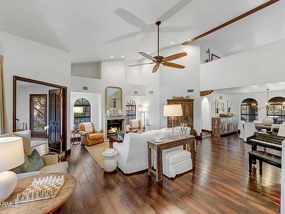 As you step inside, you'll be greeted by vaulted ceilings, rich wood accents, and beautiful arched windows that fill the home with natural light. The meticulously maintained interiors feature rich hardwood floors that add a touch of luxury and sophistication, while the elegant French limestone fireplace in the living room enhances the serene ambiance throughout.
