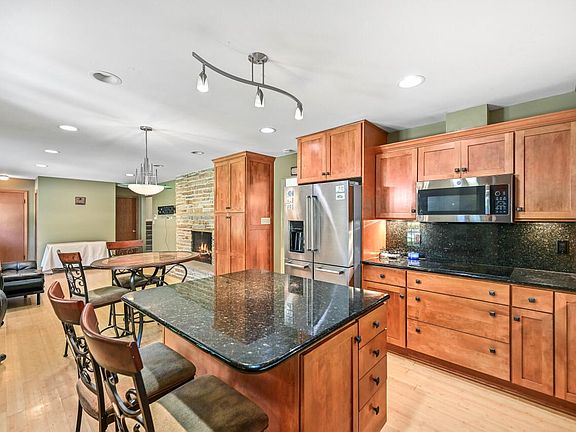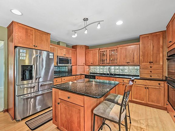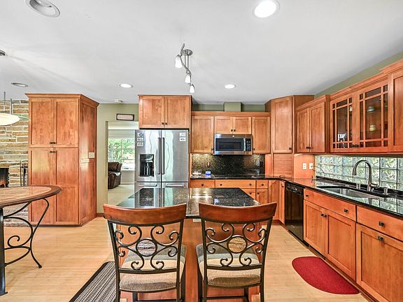 Spacious and sun-filled tri-level in desirable River Edge offers flexibility and charm. Main level features a rare bonus bedroom with updated full bath, slate tile foyer, and open living/dining with double-sided gas fireplace. Chef's kitchen boasts large island, double ovens, cooktop, custom mixer cabinet, and glass block backsplash open to cozy family room with gas fireplace and patio access. Upper level includes 3 bedrooms and updated full bath. Lower level is finished with second cooking area and rec space. Enjoy a beautifully landscaped, private backyard, perfect for entertaining. Also includes home office/den, laundry room, and attached 2.5-car garage. Numerous updates throughout--move-in ready!