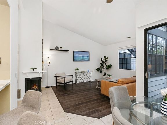 Upon entering the expansive living room with its open floor plan, you'll be greeted by soaring vaulted ceilings that infuse the space with an airy ambiance, beautifully complemented by the comforting glow of a contemporary fireplace