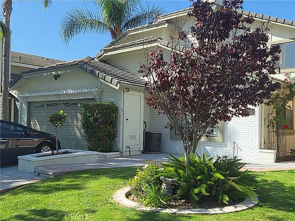 Welcome to this beautifully upgraded two-story home, tucked away on a peaceful cul-de-sac in a desirable Simi Valley neighborhood. Step through the front door and you are immediately greeted with an open, airy floor plan. To your left is the spacious living room with soaring ceilings and a dramatic triangular window that fills the space with natural light. To your right, the formal dining room provides the perfect setting for family gatherings and entertaining. Straight ahead, the comfortable carpeted staircase anchors the center of the home. Just before the stairs, you'll find a convenient powder room and two additional storage closets along the wall. To the right of the dining room, the chef's kitchen features custom cabinetry, a built-in refrigerator, professional-grade stove and oven, ample storage, and a breakfast nook. The breakfast area is enhanced by brand-new French doors that open out to the inviting backyard. The backyard has been thoughtfully designed for entertaining, with high-quality artificial turf, multiple seating areas, roses, fruit trees, and charming string lights that create a warm and welcoming ambiance in the evenings. Past the breakfast nook, with its own sliding door access from the backyard is a versatile multi-purpose room with new flooring ideal for a playroom, office, or media space. Just off this area, the laundry room provides direct access to the two-car garage. Upstairs, the expansive primary suite sits to the right, boasting a thoughtfully redesigned spacious spa-like bathroom with a large tiled rain shower, dual sinks, and a custom walk-in closet with drawers, shelves, and hanging space for every need. To the left of the stairs are two additional bedrooms, each filled with natural light, and a beautifully upgraded secondary bathroom with double sinks and a walk-in shower. The landing area offers both a linen cabinet and an additional built-in cabinet with shelving, providing plenty of storage.