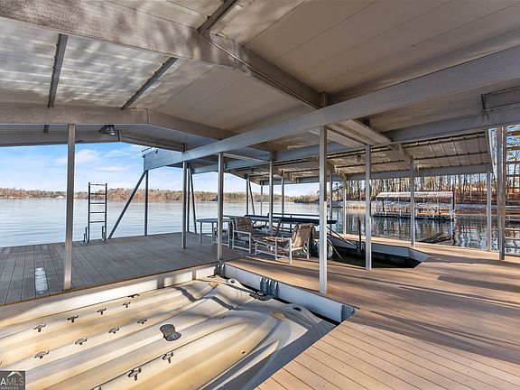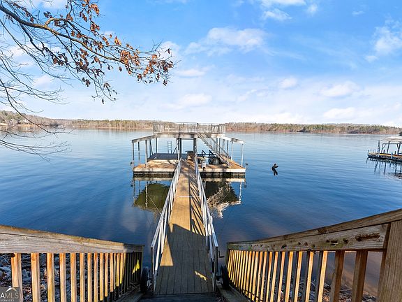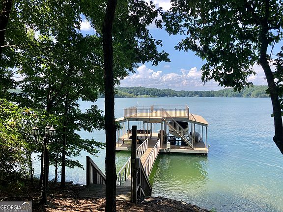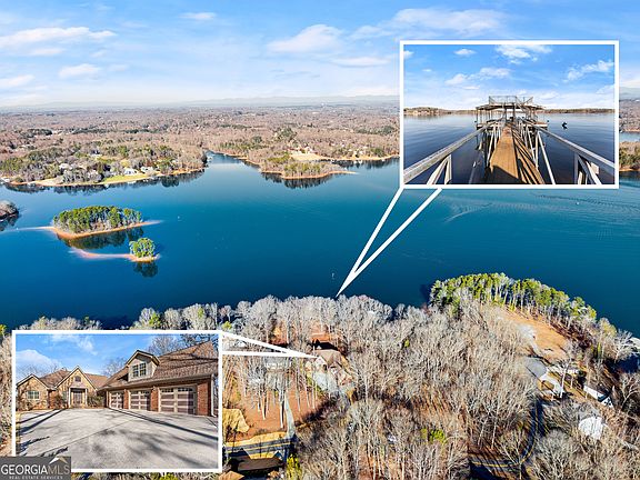 Lake, location, and luxury in one complete package! Offering all the bells and whistles, this property has 100 feet of rip-rapped shoreline, wide open deep water, a concrete cart path down to a top-of-the-line Trex / aluminum 32 x 32 dock complete with party deck, 2 covered jet ski ports, hydro hoist boat lift and security cameras, plus it is situated on one of the most desired sections of the lake. The winter views are panoramic, and with the USACE line very close to water's edge, significant year-round view enhancement possibilities abound! The estate-sized lot offers a wonderful, peaceful setting. The extremely well-built and meticulously maintained custom home has thoughtful design and function. Exterior highlights include 4-sides brick and stone, a newer 50-year roof with transferable warranty, a large level driveway, an oversized 3-car garage, a screened-in porch, and a massive, lakeside, covered, open-air veranda, with Trex flooring, that acts as a magnet for morning coffee, entertaining friends, or enjoying colorful sunsets. An open concept interior is highlighted by a fabulous great room / dining room, with a wall of lakeside windows and which showcases a stunning, wood-burning stone fireplace. Attached is a spacious kitchen with large stone island, custom cabinetry, stainless appliances and eat-in breakfast room. The owner's quarter is on the main, with gas fireplace and generous ensuite. Upstairs offers a tremendous flex space with full bath, perfect for a rec room, office, workout, bunk room, teen suite or simply another bedroom. The walk-out terrace level offers family room complete with built-in bar and gas fireplace, as well as 2 secondary bedrooms, finished workshop with amazing custom shelving, and storage galore. Sought after North Hall schools, no city taxes, minutes to I-985, the medical corridor, and New Holland shops and restaurants, plus super convenient to the vibrant Gainesville Square. Without a doubt, this is one of the BEST DEALs on the Lake!