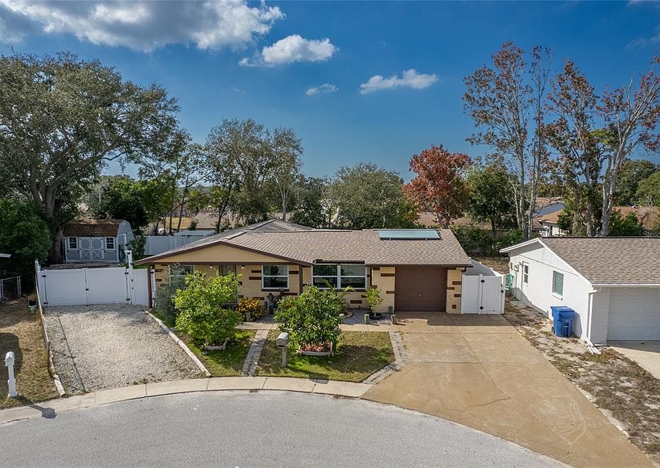 One or more photo(s) has been virtually staged. Welcome to this beautiful house, 3 bathrooms and 2 baths, a mother in law suit with their own bath is the property attraction. This charming property in Holiday, FL, offers a move-in-ready, hurricane-ready home with a wealth of features and amenities. The well-maintained house boasts recent upgrades, including a NEW VINYL FLOOR, Roof (2023), well maintain A/C unit, impact windows, and aluminum hurricane shutters for optimal storm protection. Inside, it’s equipped with modern appliances, Ethernet wiring for secure internet, and energy-efficient split A/C units. The property is fully fenced with a 6-foot vinyl fence, featuring a paved driveway with ample space for a boat or camper, and a lush yard with various fruit trees, including citrus, avocado, peach, and olive. Outdoors, enjoy a paved patio, a PVC pergola, and a 10x12 shed with hurricane-grade construction, along with an outdoor shower. The backyard is perfect for relaxing or entertaining, with automatic chicken feeders, a secure coop, and the potential for fresh eggs. Security is comprehensive, with Ring cameras, spotlights, motion sensors, and a Wi-Fi-enabled system with subscription capabilities. Additional features include a full 600 sq ft mother in law suit or workshop with a bathroom, a solar water heater, a Duxura water filtration system, and landscape irrigation. The property is primed for comfort and convenience, making it ideal for enjoying the Florida lifestyle with access to nearby amenities and natural beauty. NO CDD, NO HOA, NO FLOOD INSURANCE.
