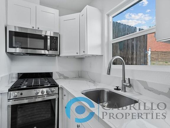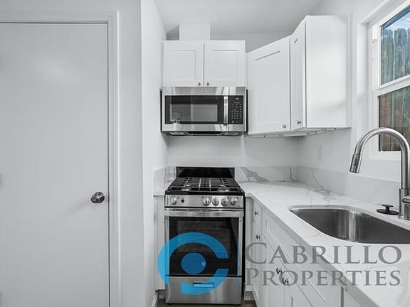 The sleek kitchen is outfitted with quartz countertops, white shaker cabinetry, and stainless steel appliances, including a gas range and built-in microwaveperfect for any home chef. A spacious main living area offers flexibility for both living and sleeping arrangements, while the elegant bathroom is appointed with designer tile, a beautifully tiled walk-in shower, and updated fixtures.