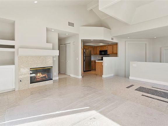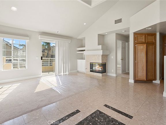 This beautifully maintained Del Prado townhome offers the perfect blend of comfort, style, and convenience. Located on an upper carriage end unit, you’ll enjoy peace and privacy with no one above or below. The corner location with expansive windows fill the home with natural sunlight throughout the day. Step inside to an elegant open-concept floor plan with soaring vaulted ceilings. The spacious living area features a cozy fireplace and opens to a private balcony overlooking the neighborhood—perfect for relaxing or entertaining. The kitchen offers ample cabinet space along with a newer microwave and dishwasher. The generous bedroom includes a closet with built-in organizers, while the bathroom boasts a dual sink vanity. Additional highlights include recessed lighting, inside full-size laundry, and an attached direct-access one-car garage.