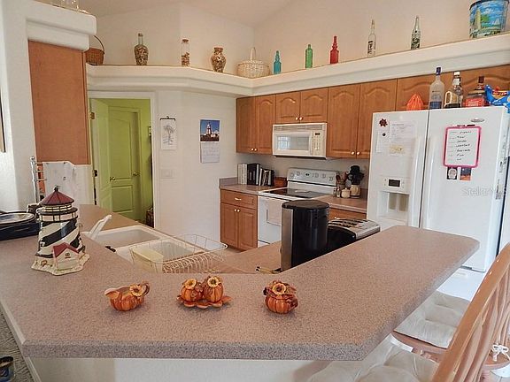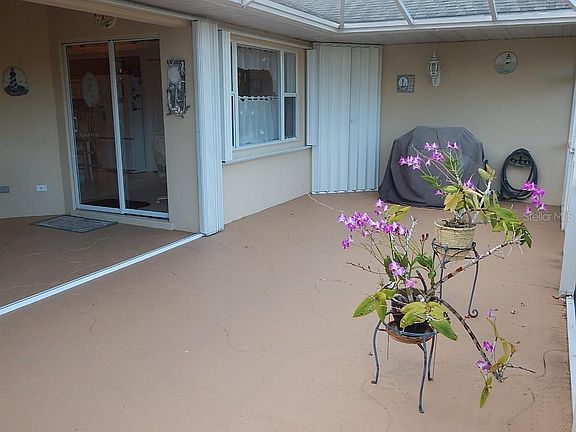Gorgeous curb appeal while pulling into your new home featuring 3 bedrooms, 2 baths, 2 car garage, a 16x10 covered lanai and another 29x12 extended screened lanai. Enter the double door entryway to a great room floor plan with cathedral ceilings, plant shelves and bullnose, rounded corners. Sliders from great room and dinette to lanai. Master offers dual sinks, garden tub with separate shower. Kitchen is open and has ample cabinets and French door fridge. Extras to include A/C in 2011 and whole house hurricane accordian shutters in 2016. Inside laundry room offers extra cabinetry, a laundry tub and MANABLOC plumbing. Beautiful landscaping surrounds this home.