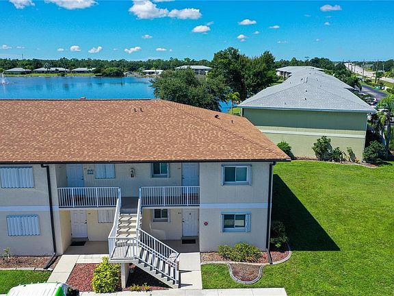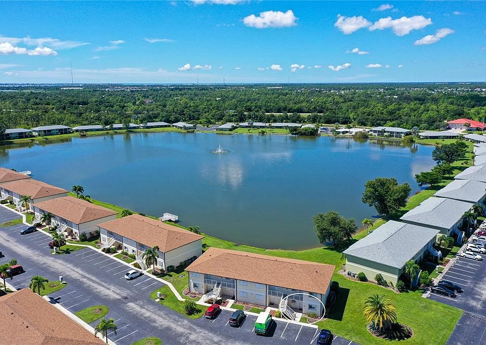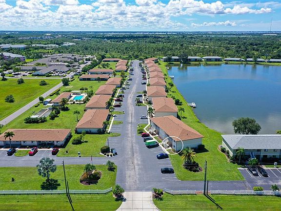 Gorgeous LAKE views and a short walk to the pool can be yours in this ALL TILE floor home with IMPACT windows plus hurricane shutters. Have peace of mind with a NEW ROOF in 2023. Inside, the open kitchen, great room, lanai and en suite primary bedroom take advantage of the lake view. The kitchen boasts corian countertops, a Bosch dishwasher, and a new stove (March 2025). Chat with neighbors on your 12'x5' front porch, or appreciate the serene lake on the 12'x8' screened lanai. Abundant closet space includes a walk-in closet and linen closets. The washer and dryer are tucked away inside the unit near the second bedroom. Only 116 units can use the gated pool area encompassing the large pool, sun deck, clubhouse, and restrooms. Bocce Ball and fishing piers add to the fun. The Deep Creek Golf Course is moments away. I-75 and US-41 are easily accessible to quickly arrive at the Punta Gorda Airport, Fort Myers, Sarasota, and Naples. It's no wonder that Punta Gorda has been named one of the best small cities in the Sunshine State! A harbor walk along the Peace River will delight you at every turn of the paved trail, dotted with waterfront restaurants, pickleball courts, and occasional live musical entertainment at Gilcrest Park. The Florida lifestyle is so easy and affordable to enjoy at this lovely home!